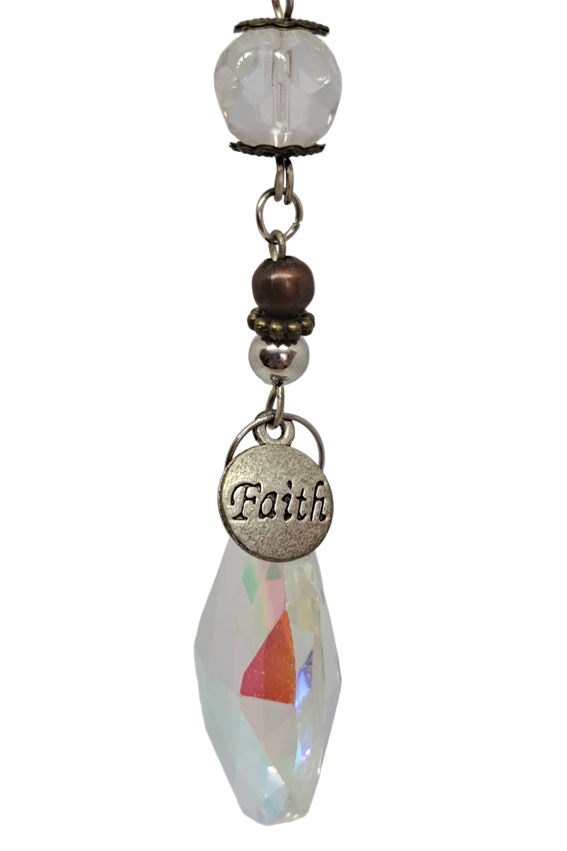 Ce pendentif arbre de vie est réalisé en fil de cuivre et décoré de pierres naturelles, représentant les sept chakras ou les saisons. Chaque branche porte une couleur différente, associée à l’énergie et à l’équilibre. La pampille de cristal, associée à des perles métalliques et translucides, capte la lumière et diffuse de subtils reflets arc-en-ciel. Idéal comme capteur de soleil, outil Feng Shui ou décoration spirituelle.