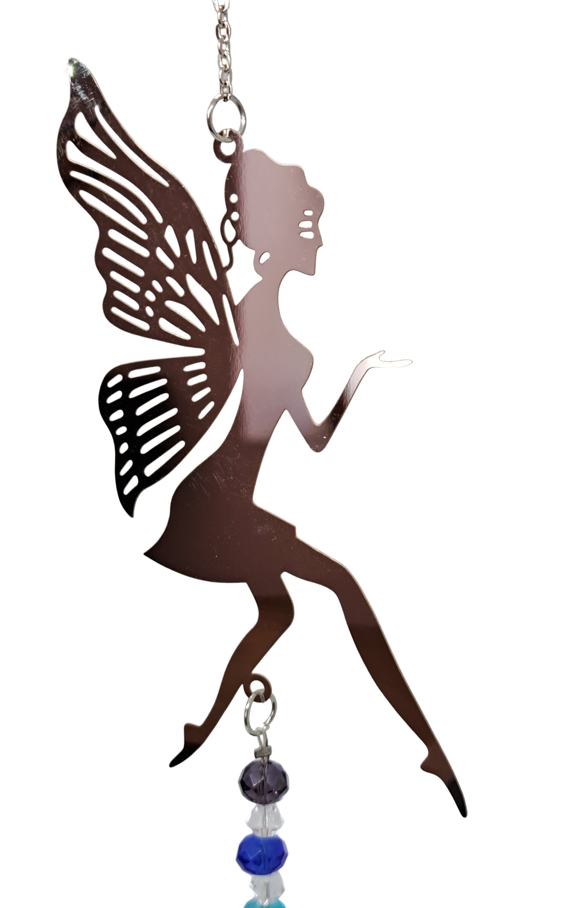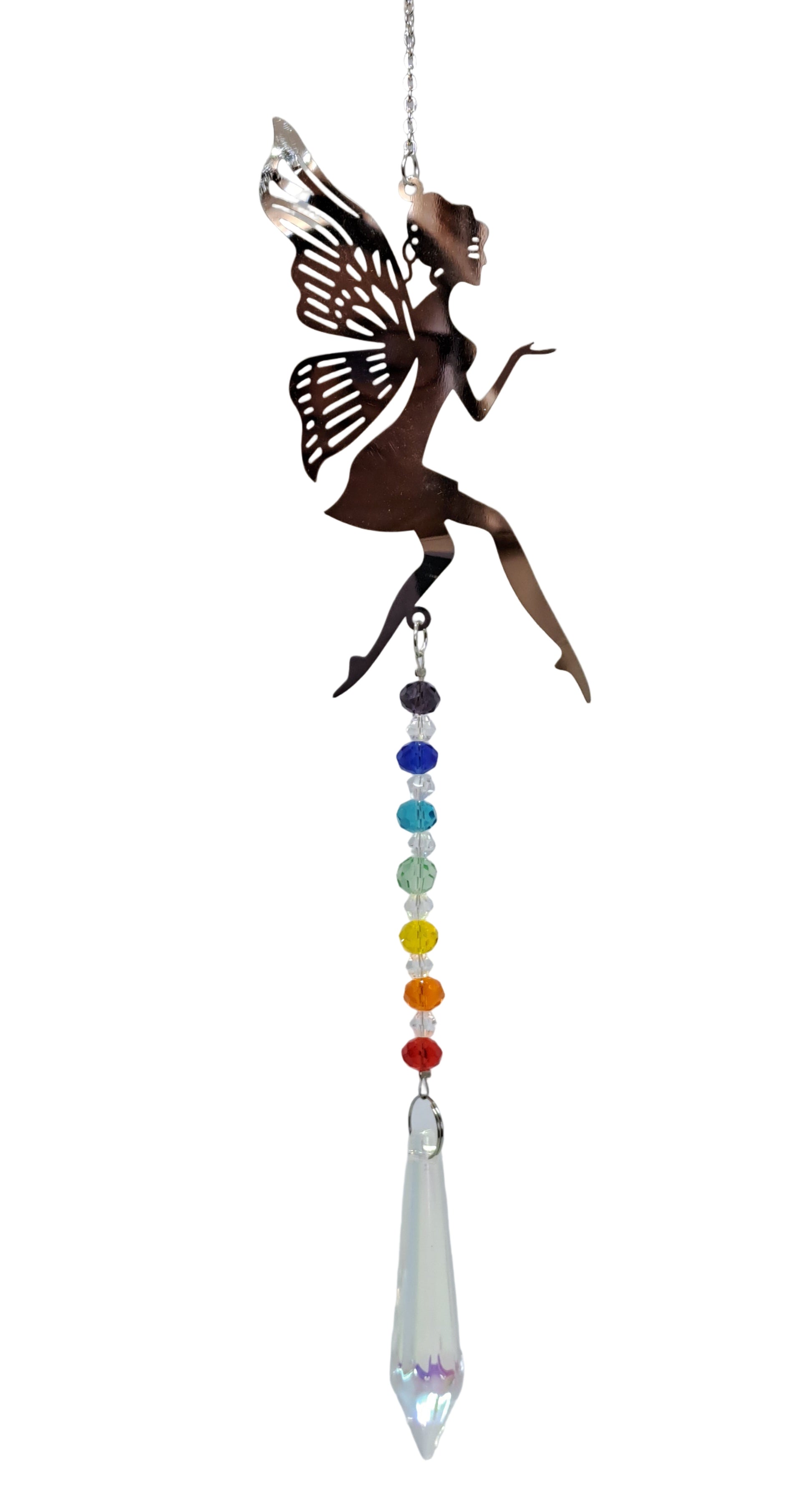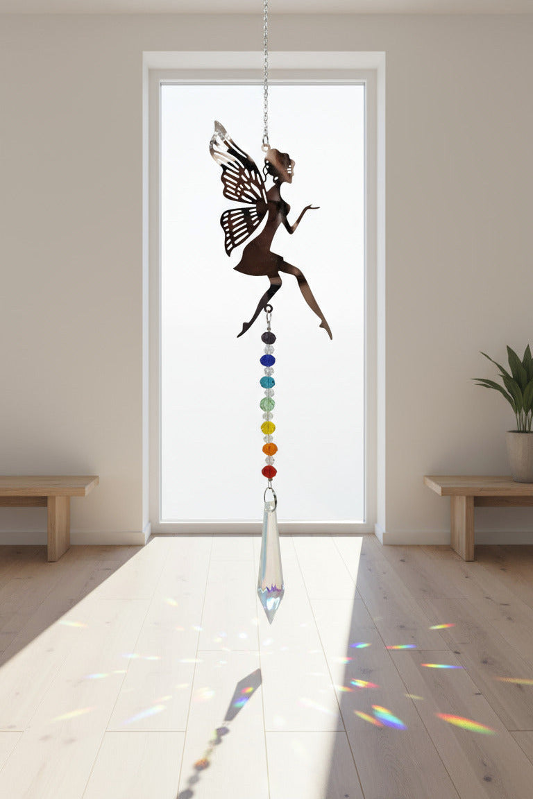 Cette suspension capteur de soleil met en scène une fée élégante découpée dans le métal, flottant au-dessus d’une cascade de perles aux couleurs des sept chakras. À son extrémité, une pampille cristal diffuse de magnifiques reflets dès qu’elle capte la lumière, créant une atmosphère magique et bienfaisante. Ce modèle allie la symbolique spirituelle de l’équilibre énergétique au charme féerique.