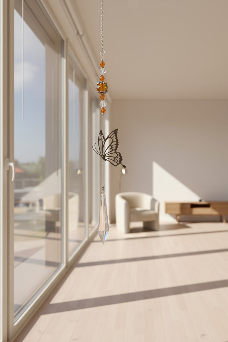 Papillon orange suspendu & pampille cristal – Éclat solaire
