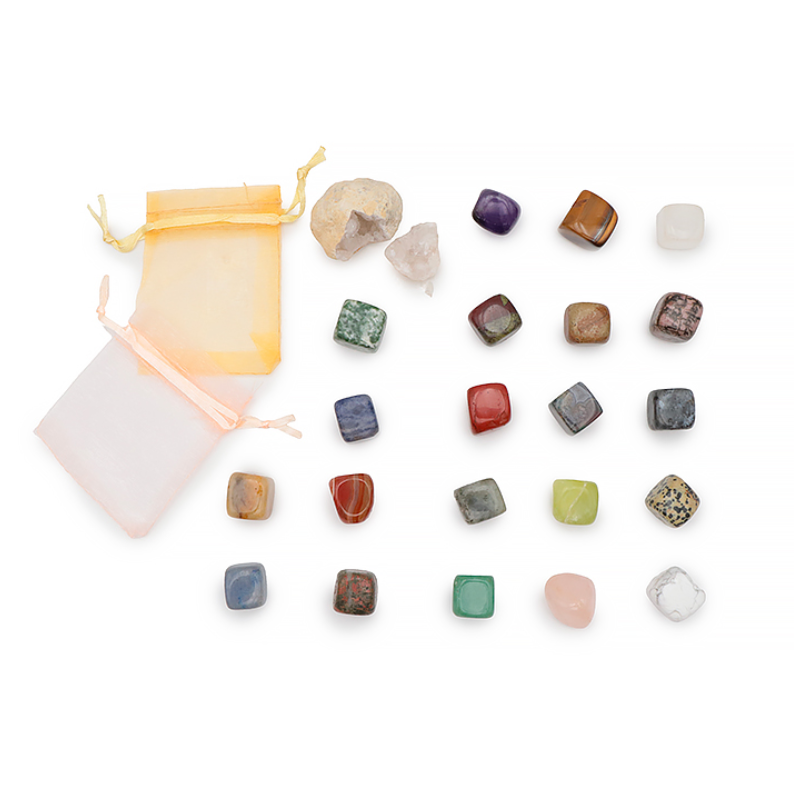 Ce calendrier renferme une sélection de pierres roulées et mini-trésors énergétiques, parmi lesquelles :