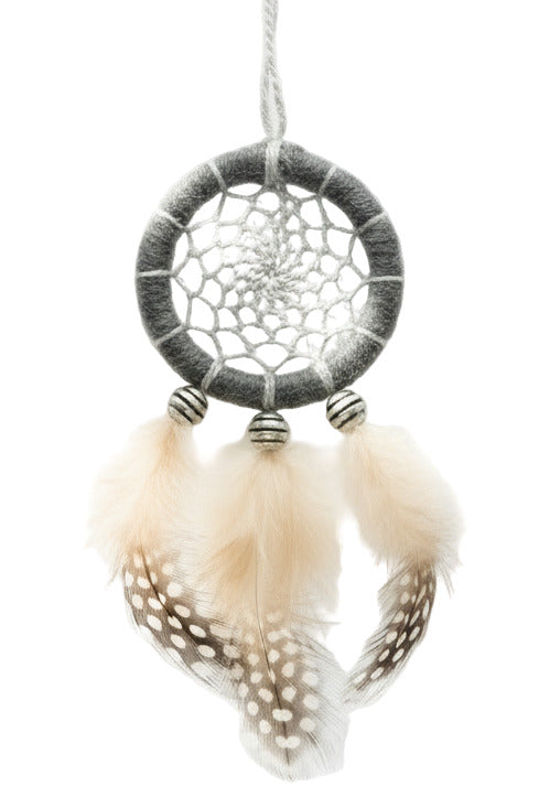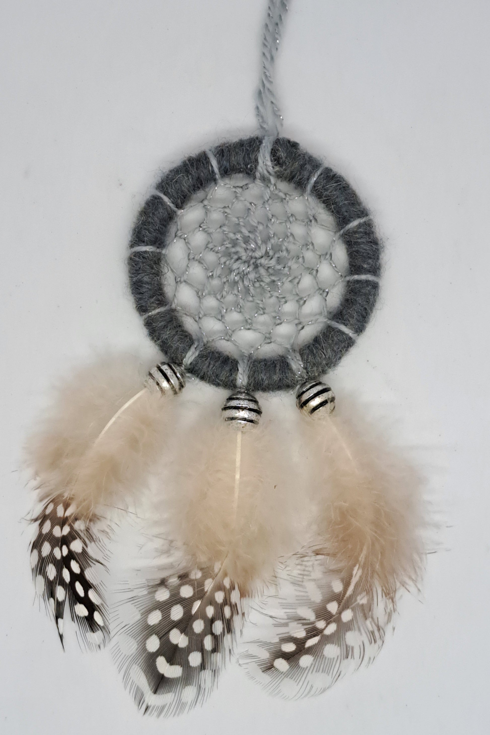 Invitez la douceur et l’harmonie dans votre intérieur avec ce mini attrape-rêve artisanal aux teintes neutres et naturelles. Son cercle de 6 cm, habillé d’un fil gris, est tissé de fil argenté pour une toile lumineuse et sobre. Trois belles plumes légères aux reflets crème mouchetées, sont accompagnées de perles métal argenté pour un contraste raffiné.