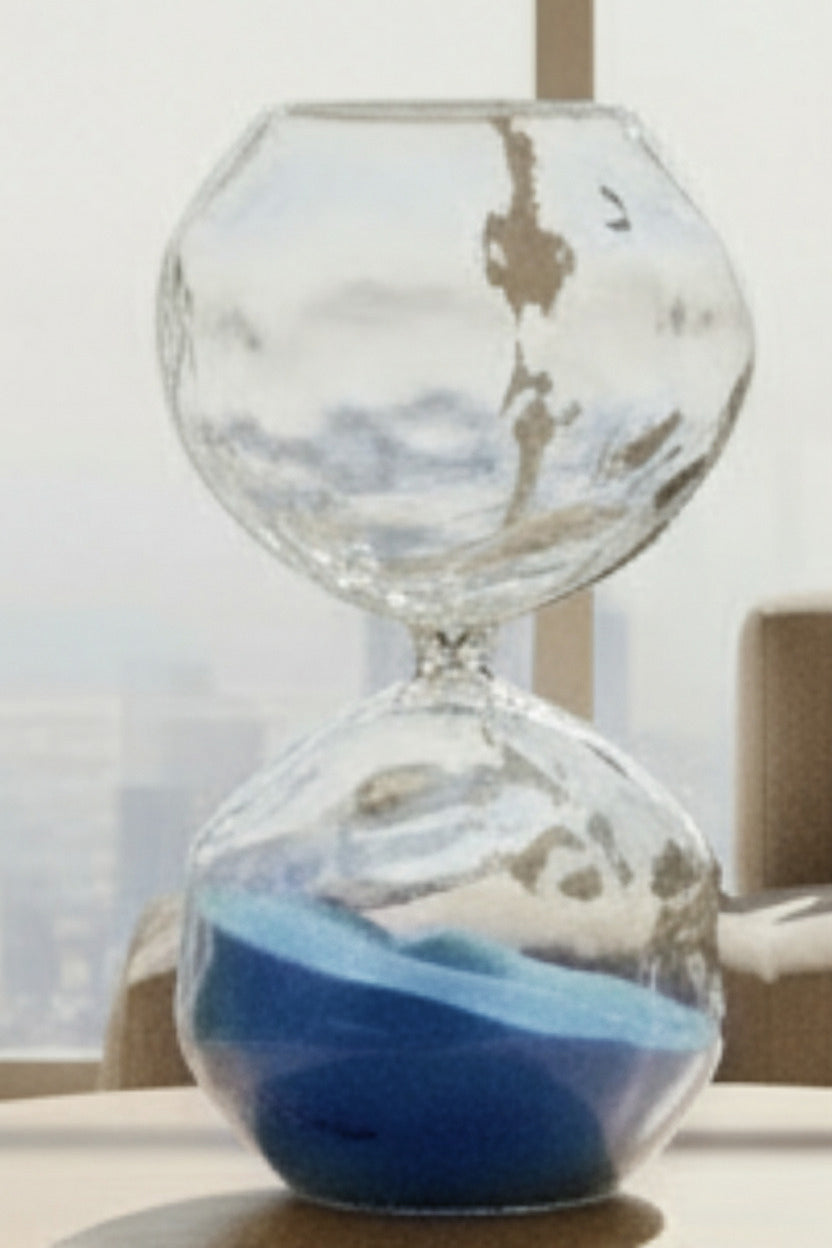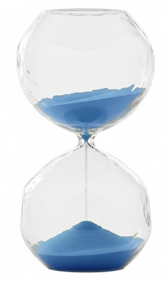 Sablier en verre soufflé artisanal, sable bleu glacier